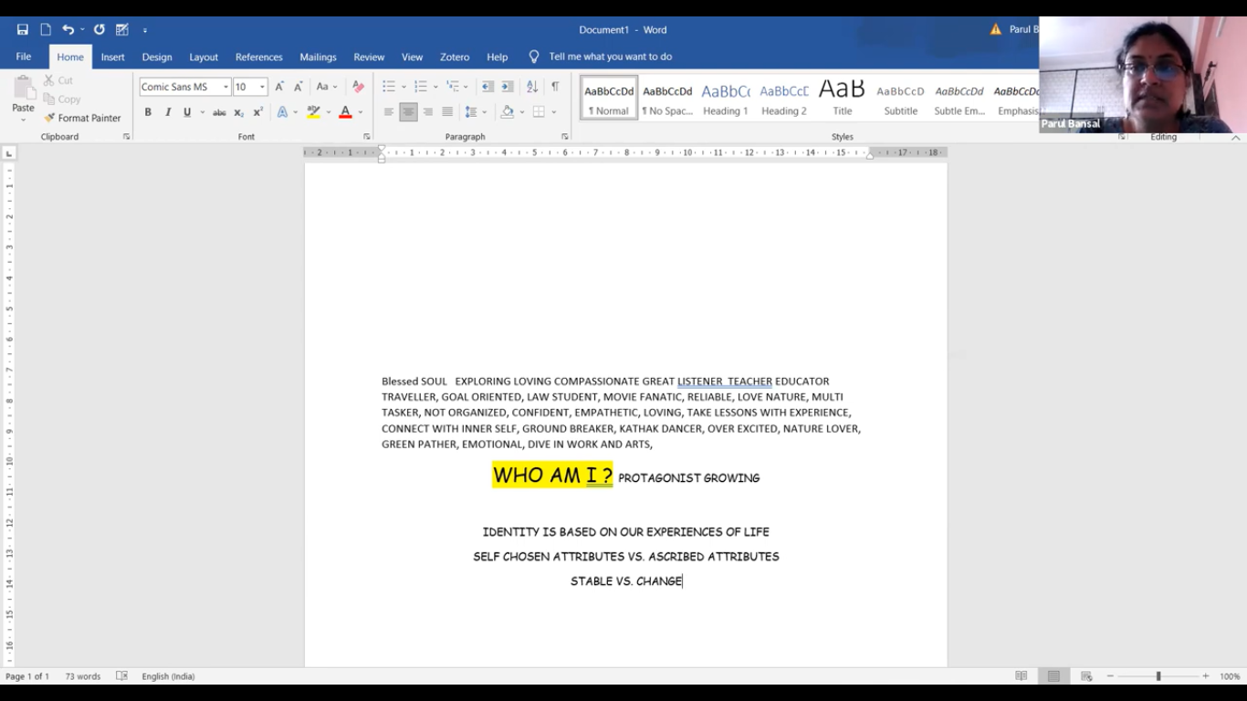 One of the important aspects of exploring oneself also required the fellows to understand the ‘markers’ of their Identity, including their sexual identity. Identity does not exist in isolation and is formed when a two-way relationship is established with ‘significant others’ influenced by how one behaves in these relationships based on values, attitudes, and beliefs. To understand Identity from an everyday perspective, Dr. Parul Bansal was invited to facilitate a session this week with the fellows. Dr. Parul Bansal is an Assistant Professor of Psychology at Lady Shri Ram College for Women. Her areas of academic interest include Psychoanalysis, Critical Psychology, and Psychology of Social. Her doctoral work explored identity processes amongst urban Indian youth and was published as a research text titled "Youth in Contemporary India: Images of Identity and Social Change" by Springer.
