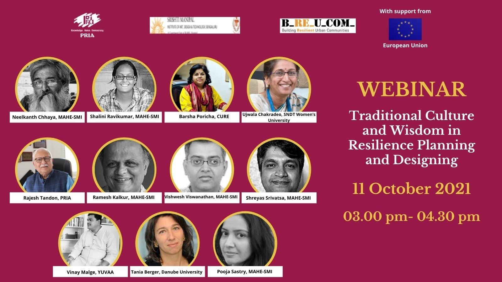 This webinar explores the interconnections between culture and community, to introspect how these links play a role in promoting sustainable urban resilience. Participatory Research in Asia (PRIA), Building Resilient Urban Communities (BREUCOM) and SHRISTI Manipal Institute of Art, Design and Technology will be hosting a webinar “Traditional Culture and Wisdom in Resilience Planning and Designing” on 11 October (Monday) from 3.00 pm to 4.30 pm. It aims to examine the role of higher education institutions to build momentum for drawing complementarities between ecology and livelihood interests, by incorporating traditional and cultural practices of local communities in their teaching and pedagogy.