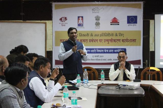 PRIA in association with the Local Self Government Department Rajasthan, HCM-RIPA (Rajasthan State Institute of Public Administration) and City Managers' Association Rajasthan organized a one day orientation training workshop for elected representatives of urban local bodies. The workshop was attended by 31 elected councillors from 5 ULBs of Beawar, Vijainagar, Parbatsar, Kekri and Ajmer. The Mayor of Ajmer Nagar Nigam and Chairpersons of Beawar Nagar Parishad and Parbatsar Nagar Palika also participated in the orientation workshop. The program was structured in 3 interactive sessions focusing on rapid assessment, processes & methods of solid waste management and roles & responsibilities of elected representatives.