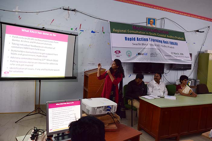 The consultation aimed to introduce RALU to the partners and stakeholders working in the field of sanitation at the grassroots level in the district, Mandal and village. The main aim of the consultation was to introduce RALU and its activities to all the stakeholders working on the issues of sanitation at the grass-root level in the south coastal region of AP. As a part of the field visits undertaken by the RALU team, case studies were documented and the findings of the same were shared among the participants. Case studies were documented as a part of the documentation component of RALU for disseminating the field level experiences of ODF, Non-ODF and NGP slipped back villages and these case studies were presented to the participants by the RALU team.