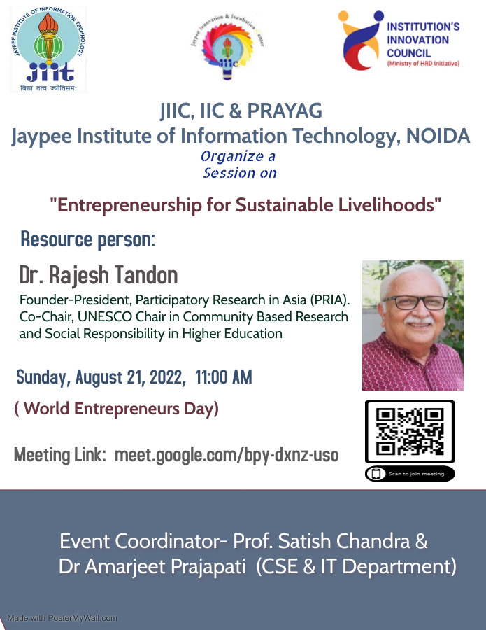 An online half-day session consisting of lectures and discussions marked World Entrepreneurs Day on 21st August 2022 at Jaypee Institute of Information Technology, Noida. Dr. Rajesh Tandon was the resource person for this event and this lecture was focused on "Entrepreneurship for Sustainable Development".