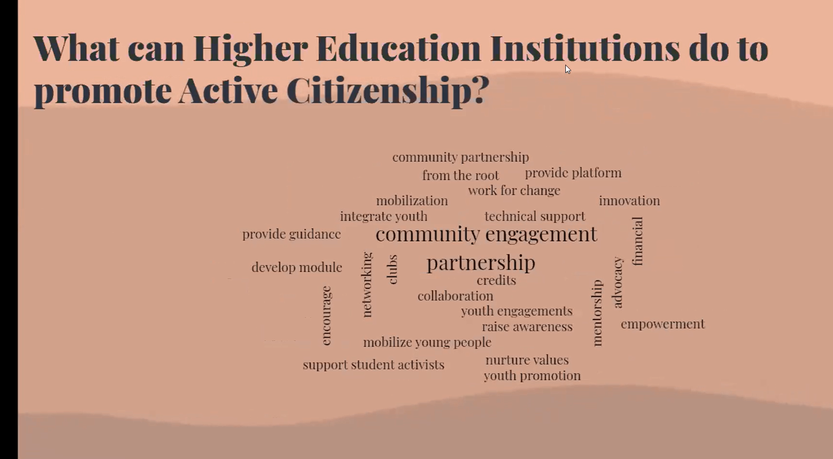 During the symposium, participants were asked two questions, and their responses to the questions are presented in the word clouds below.