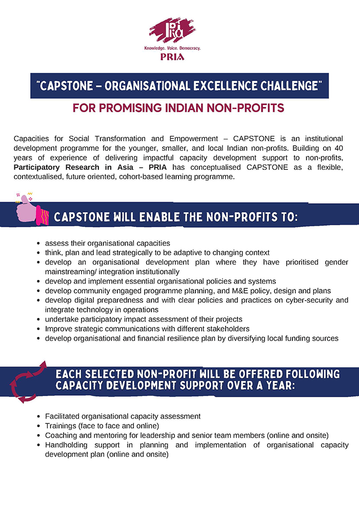 CAPSTONE is an institutional development programme for the young and promising Indian non-profits. Building on 40 years of experience of delivering impactful capacity development support to non-profits, Participatory Research in Asia – PRIA has conceptualised CAPSTONE as a highly flexible, contextualised, futuristic, cohort-based learning programme.