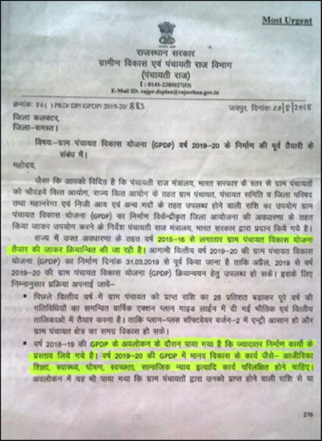 इसे आप विडमà¥à¤¬à¤¨à¤¾ ही कह सकते है, कà¥à¤¯à¥‹à¤‚कि पेशे से इंजीनियर होने की वजह से महेशà¥à¤µà¤°à¥€ जी की à¤à¥€ रूचि निरà¥à¤®à¤¾à¤£ कारà¥à¤¯à¥‹à¤‚ के पà¥à¤°à¤¤à¤¿ जà¥à¤¯à¤¾à¤¦à¤¾ थी| हमारी फाइल उनके पास कà¥à¤› दिनों तक पड़ी रही और दिनांक 9 अगसà¥à¤¤ को हमारे फॉलोअप करने के पशà¥à¤šà¤¾à¤¤ दिनांक 10 अगसà¥à¤¤ को उनà¥à¤¹à¥‹à¤‚ने यह कहते हà¥à¤ उस पतà¥à¤° को शà¥à¤°à¥€ सी.à¤à¤® मीना जी को मारà¥à¤• कर दिया की अब समय निकल चà¥à¤•ा है और हमें इन मà¥à¤¦à¥à¤¦à¥‹à¤‚ को GPDP (2019-20) में शामिल करवाने का पà¥à¤°à¤¯à¤¾à¤¸ करना चाहिà¤| सच में 15 अगसà¥à¤¤ की गà¥à¤°à¤¾à¤® सà¤à¤¾ में इन मà¥à¤¦à¥à¤¦à¥‹à¤‚ को शामिल करवाने का समय तो निकल चà¥à¤•ा था पर हमारे सामने GPDP (2019-20) के रूप में à¤à¤• बड़ा मौका उपलबà¥à¤§ था, जिसकी तैयारी 02 अकà¥à¤Ÿà¥‚बर 2018 से पà¥à¤°à¤¾à¤°à¤‚ठहो रही थी| अतः हमने पà¥à¤¨à¤ƒ विà¤à¤¾à¤—ीय सà¥à¤¤à¤° पर संपरà¥à¤• आरंठलिया| इस दौरान हमने शà¥à¤°à¥€ सी.à¤à¤® मीना, संयà¥à¤•à¥à¤¤ सचिव (पà¥à¤²à¤¾à¤¨), शà¥à¤°à¥€ पी.आर. शरà¥à¤®à¤¾ (सलाहकार) तथा शà¥à¤°à¥€ नीरज à¤à¤¾ (सलाहकार-आईईसी) से कई मà¥à¤²à¤¾à¤•ातें की à¤à¤µà¤‚ उनà¥à¤¹à¥‡à¤‚ इस बात पर सहमत (Convince) किया कि जब तक विà¤à¤¾à¤— दà¥à¤µà¤¾à¤°à¤¾ राजà¥à¤¯ सà¥à¤¤à¤° से GPDP में 'लो कॉसà¥à¤Ÿ - नो कॉसà¥à¤Ÿ' गतिविधियों को शामिल करने के लिठविसà¥à¤¤à¥ƒà¤¤ दिशानिरà¥à¤¦à¥‡à¤¶ जारी नहीं किये जायेंगे, तब तक पंचायत सà¥à¤¤à¤° पर इनà¥à¤¹à¥‡à¤‚ सिरà¥à¤« खानापूरà¥à¤¤à¤¿ की तरह इसà¥à¤¤à¥‡à¤®à¤¾à¤² किया जायेगा| अंततः सà¤à¥€ के सामूहिक पà¥à¤°à¤¯à¤¾à¤¸à¥‹à¤‚ से दिनांक 20 अगसà¥à¤¤ 2018 को सà¤à¥€ कलेकà¥à¤Ÿà¤°à¥à¤¸ के लिठशà¥à¤°à¥€ राजेशà¥à¤µà¤° सिंह (IAS), पà¥à¤°à¤®à¥à¤– शासन सचिव, गà¥à¤°à¤¾à¤®à¥€à¤£ विकास à¤à¤µà¤‚ पंचायती राज, राजसà¥à¤¥à¤¾à¤¨ सरकार के दà¥à¤µà¤¾à¤°à¤¾ हिनà¥à¤¦à¥€ में à¤à¤• पतà¥à¤° (PRD/DP/GPDP/2019-20/883) जारी किया गया, जिसके ऊपर अंगà¥à¤°à¥‡à¤œà¥€ à¤à¤¾à¤·à¤¾ में लिखा गया था, "Most Urgent"| इस पतà¥à¤° के कà¥à¤› अति महतà¥à¤µà¤ªà¥‚रà¥à¤£ निरà¥à¤¦à¥‡à¤¶ इस पà¥à¤°à¤•ार है: