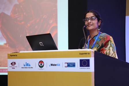 Presenting the research findings from the study ‘Bodies of Accumulation’ with women sanitation workers in Jhansi under the project ‘Engaged Citizens, Responsive City’, she shared that the objective of the study was to explore and understand the lives of women sanitation workers and the associated problematics of dignity in their everyday lives. She brought to everyone’s knowledge the crude reality and deplorable conditions faced by the sanitation workers every day. While the permanent workers are relatively better off in terms of security and work entitlements, contractual and outsourced workers have the most exploitative work conditions. Though the nature and type of work is same for all three categories of sanitation workers, pay scale for each category is different. In spite of the nature of their work where they deal with toxic waste, faecal waste, glass and other dangerous substances on a daily basis, none of the workers receive any medical insurance.