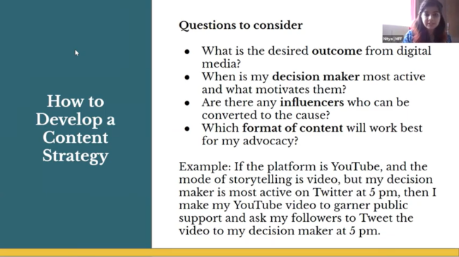 This week at the Youth-n-Democracy Fellowship, fellows were introduced to the topic of Digital Advocacy. The session was facilitated by Ms. Nitya Sriram from Martha Farrell Foundation and aimed at imparting the skills for digital advocacy. The session started with a brief discussion around the importance of social media. Fellows shared about its ability to connect and network, learn about issues and organization, platform for youth to lead change, as some of the reasons. Nitya further helped fellows in having a better understanding of the importance of using social media platforms. Social media platforms can be used for building solidarity, awareness, decision-makers attention, policy action, information sharing, coordination and collaboration, immediate relief, and mobilization, she added. For example, journalists try to bring light to the issue, which is often left out by traditional media through their social media platforms.