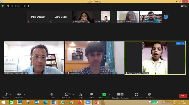 The learning circle was attended by 35 participants and included representation from civil society organizations, academicians working on adolescent health and adolescent peer educators from Mumbai, Sitapur (UP), Gurugram and Lucknow. The session was moderated by Dr. Anshuman Karol from PRIA. The learners were joined by Mr. Ram Aravind (PRIA), Ms. Leena Uppal (MAMTA), Dr. Rama Shyam (SNEHA), Dr. Neelam Singh (Vatsalya), Dr. Manish Thakre (Save the Children) and Dr.KG Santhya (Population Council). Besides expert opinion on the topic, peer educators enlightened the learners with their perspectives about AFHC from the grassroot.