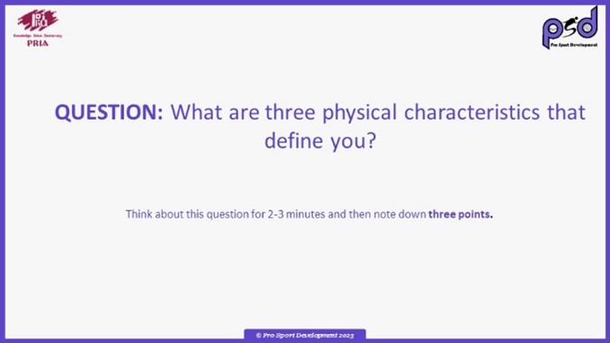 In addition to exploring the concept of self and reflecting on physical characteristics, the session included a discussion about body types and challenging stereotypes by not conforming to societal norms regarding appearance. The significance of embracing diverse body types was emphasised. Fellows were asked to consider the physical characteristics that define professional athletes. Responses included agility, energy level, height, and other similar attributes.