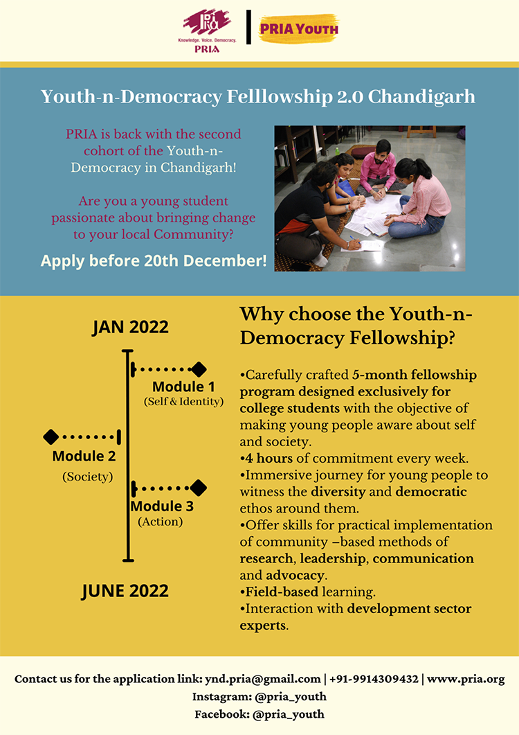 PRIA Youth is dedicated to helping youth become aware, active, and engaged citizens, to make democracy function in their everyday lives. The PRIA Youth-N-Democracy Fellowship aims to engage independent, motivated, and creative young adults who are interested in promoting democracy in their community. The fellowship will explore topics of self-identity, critical thinking, social responsibility, research competencies, leadership, and problem-solving as well as understanding democracy in everyday life.